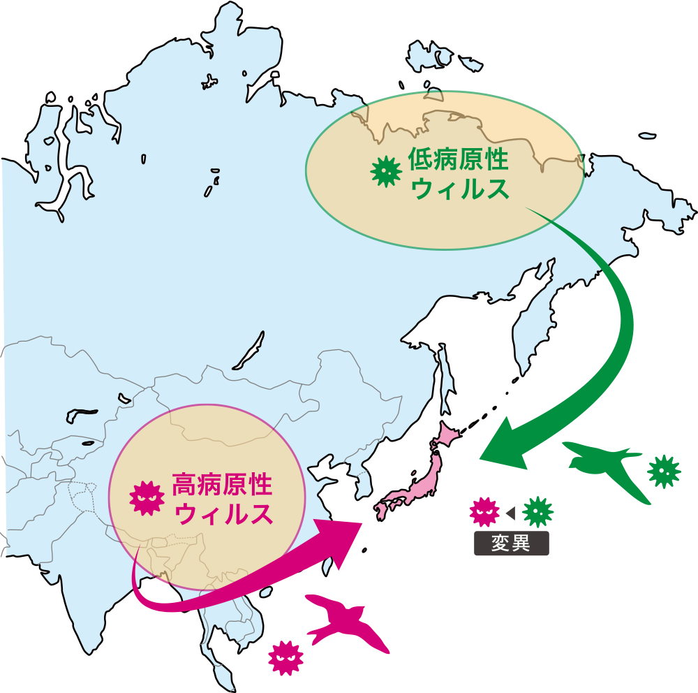 高病原性インフルエンザは、主に大陸より渡り鳥により日本国内へ持ち込まれます。