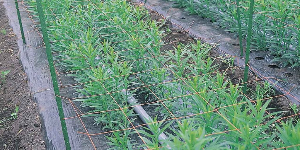 「フラワーネット」は、主に花などの茎が上に向かって立ち上がる植物の倒伏防止に用いるもので、品質の高いまっすぐな茎の育成や、折損や倒伏の防止に大変効果的です。