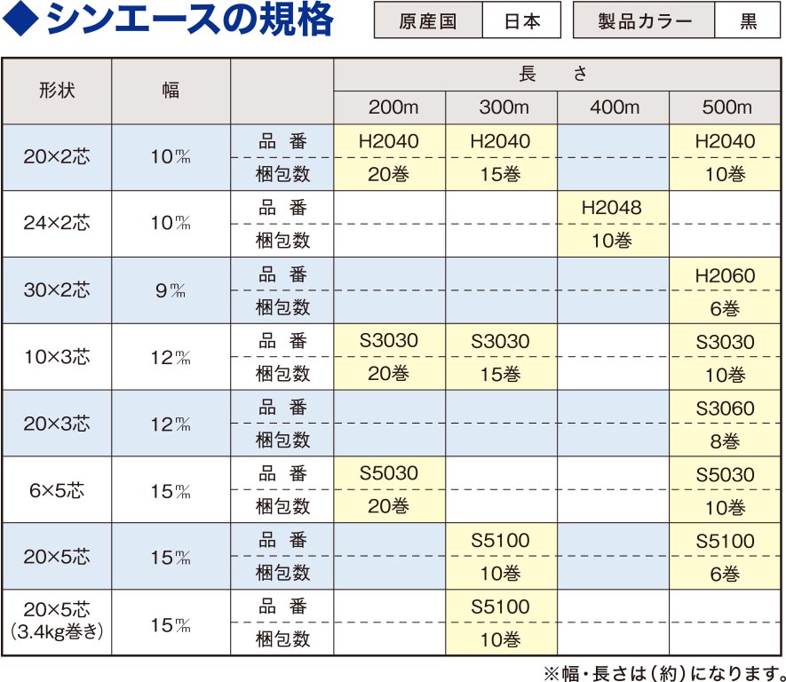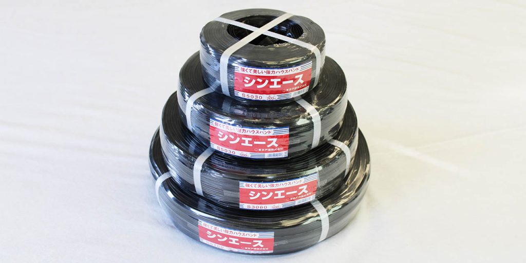 「シンエース」は東京戸張が研究を重ね、独自に創りあげた高強度ハウスバンドです。バンド内には強力糸を束ねた2つから5つ芯が埋め込まれており、使用環境に合わせ強度をお選びいただけます。高単位のPEから作られているため滑らかで作業性にも優れ、ハウスフィルムのばたつきを防ぐ目的だけでなく、各種ネットの張り糸としてもお使いいただけます。