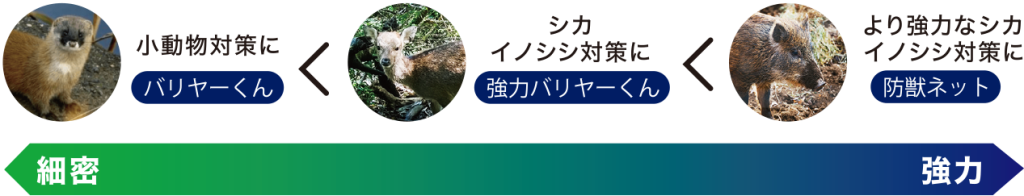 それ以外にもハクビシンなど中型の動物に特化した網目の細かい「バリヤーくん」などの規格も準備されており、対策を行う動物に合わせた規格をお選びいただくことが可能です。