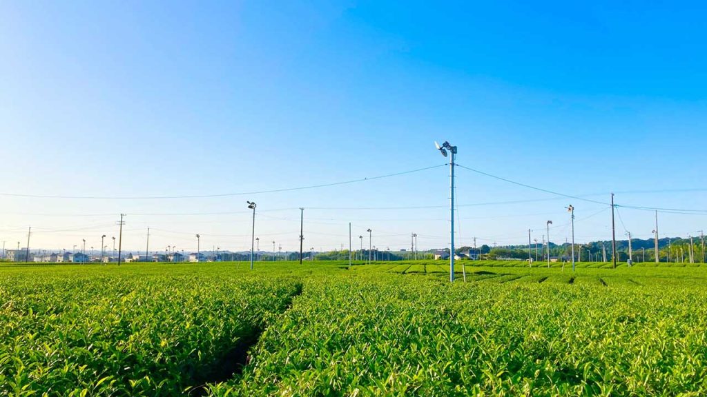 分かりやすく言えば「お茶畑の上に設置された扇風機」ですがおそらく多くの方は、あの扇風機(防霜ファン)が高速回転している様子を見たことがないと思います。防霜ファンは主に霜の発生が予想される風の弱い夜間~朝にかけて自動運転されています。
