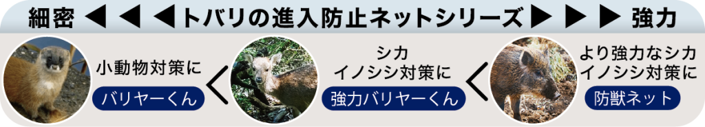 東京戸張の防獣ネットシリーズは【防獣ネット】【バリヤーくん】【強力バリヤーくん】の、大きくわけて3種類があります。この3種類から対策範囲に合わせた大きさをチョイスできます。