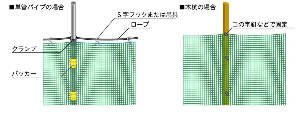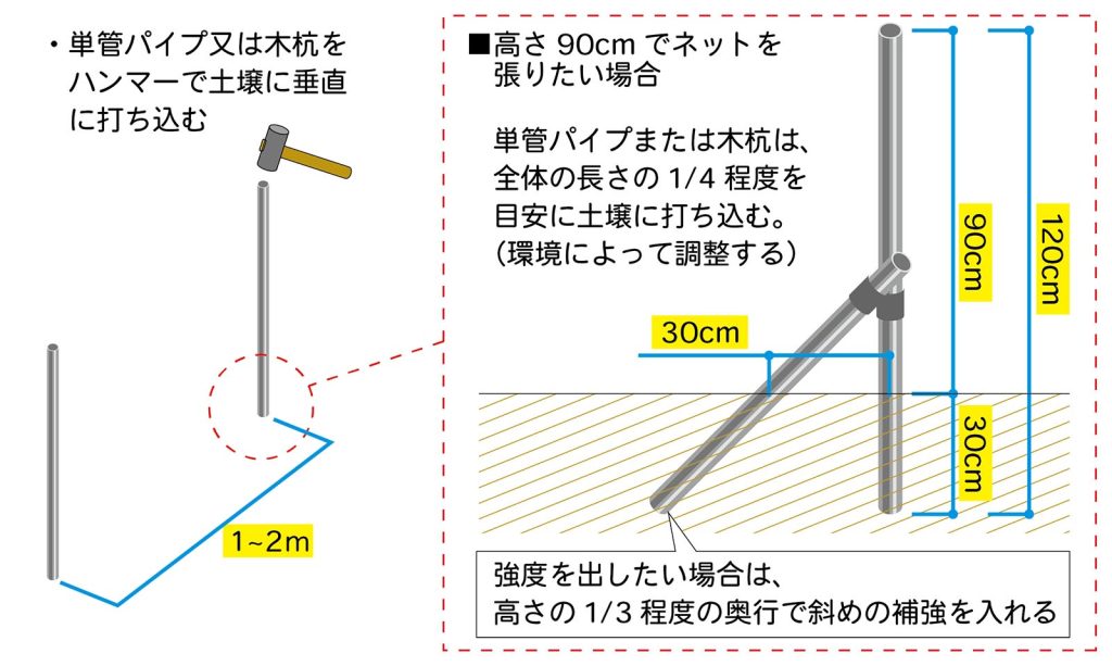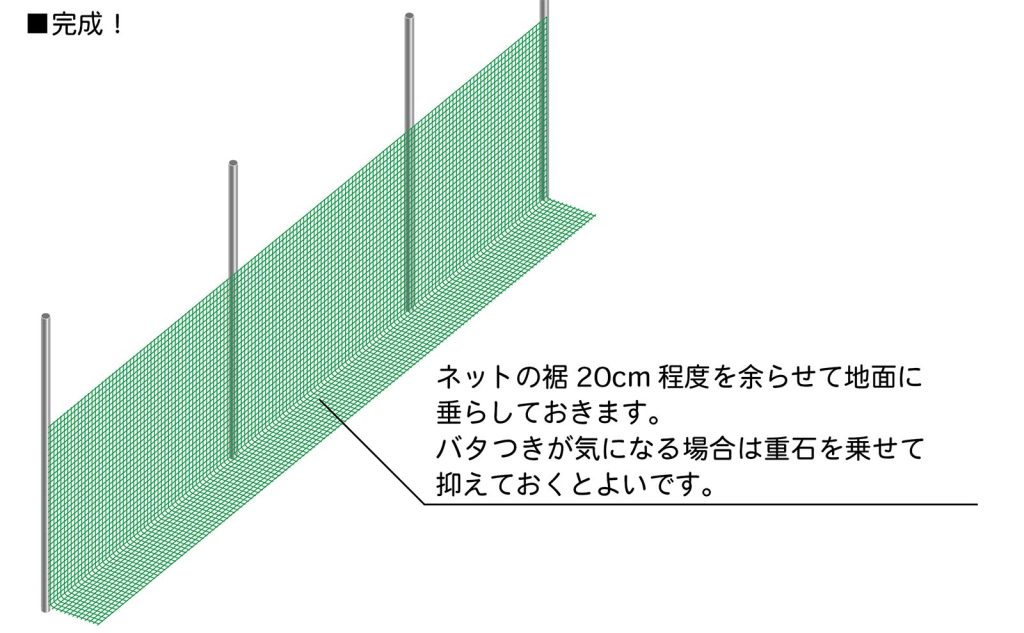 設置する際は、1~2m間隔の杭に張って対策しましょう。高さは60cm程度を目安にし、裾を20cmほど広げて垂らします。