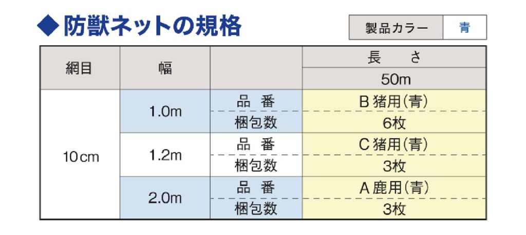 網目が10cmと大きく、強い糸を使用しており、「シカ」「イノシシ」にフォーカスした汎用性の高い規格で、3種の中で最も強度があります。菱目状の網が適度に伸縮することで、圃場の形に対応するため作業がしやすいです。