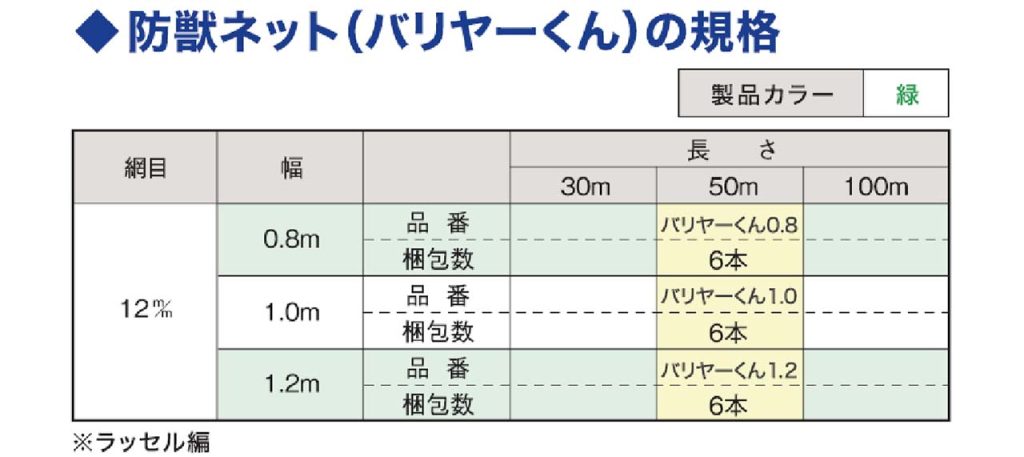 網目は「ラッセル編み」で、結び目がない特殊な編み方をしているため形状の変化に強いです。幅(設置時の高さ)が小さいため、大型の動物やジャンプ力のあるシカには向きません。