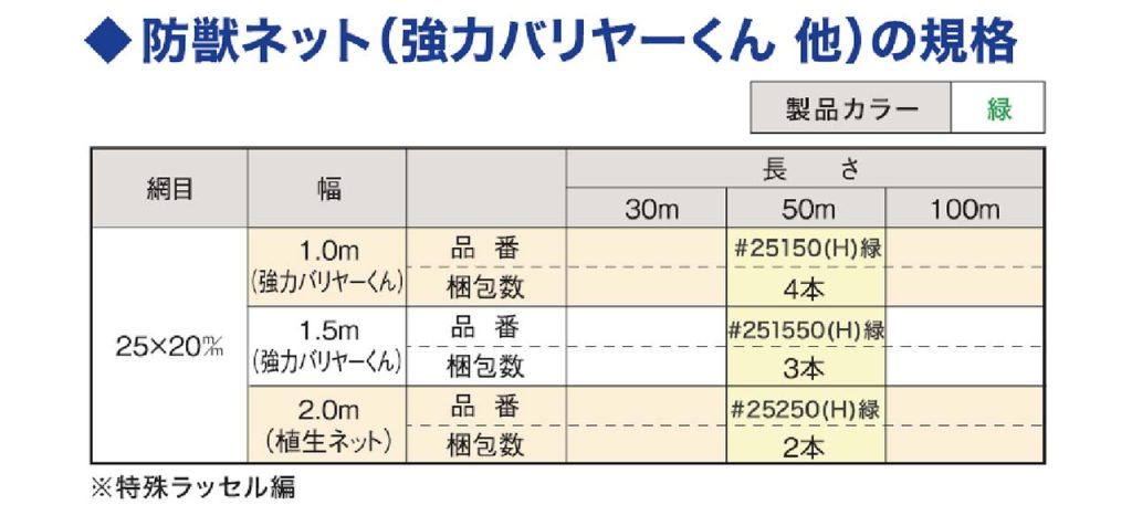 網目20~25mmと比較的小さく小型の害獣~シカなど対象に汎用性があります。網目は「ラッセル編み」で、結び目がない特殊な編み方をしているため形状の変化に強いです。 ジャンプ力があるシカを対象とする場合は幅2mを選定してください。さらに強度が必要な場合はシリーズの【防獣ネット】がおすすめです。