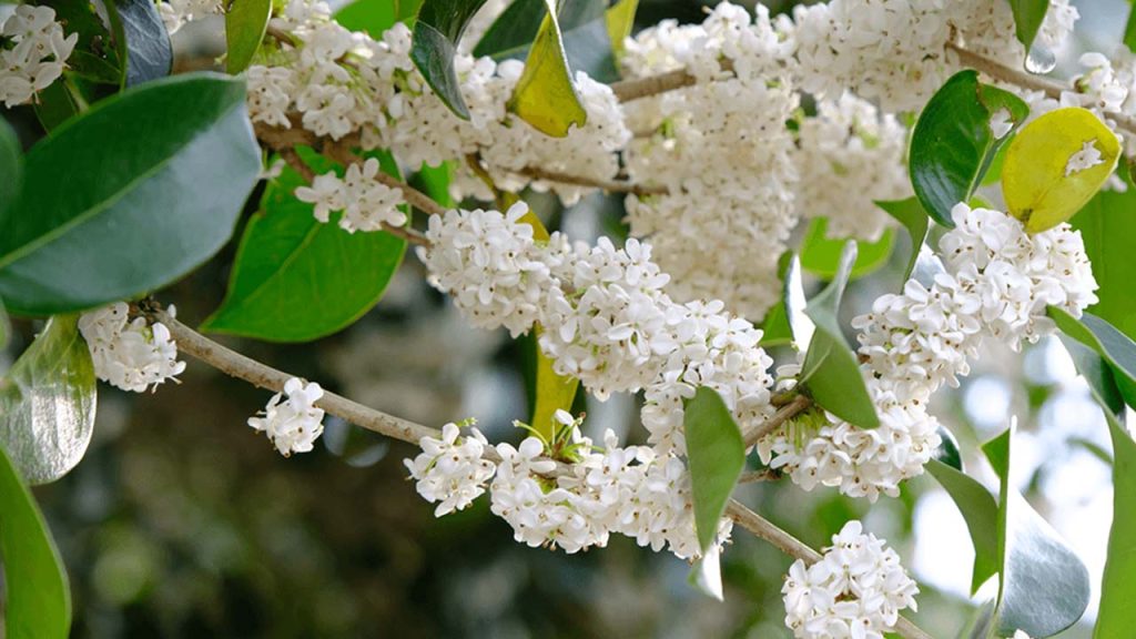 白い花を咲かせ、香りはやや控えめ。日本では庭木としても人気。