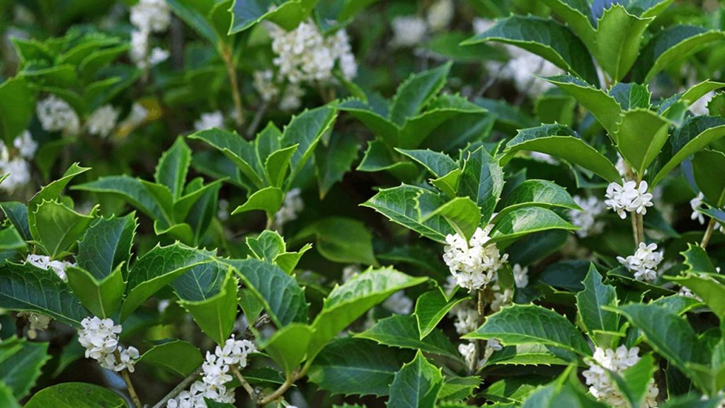 ヒイラギとモクセイの交雑種で、白い花を咲かせ、香りはやや控えめ。葉のギザギザが特徴。防犯・目隠しにも利用されます。