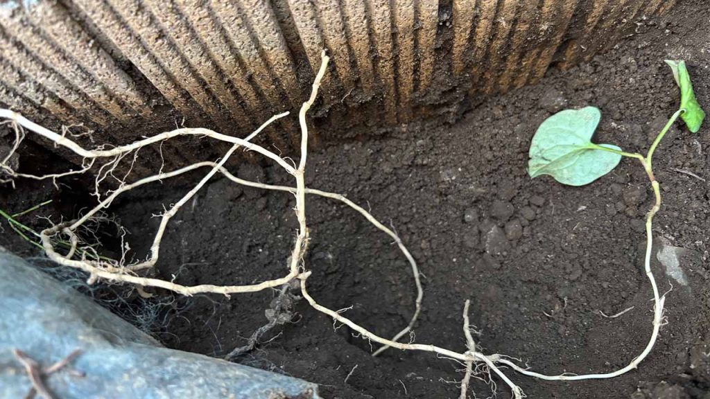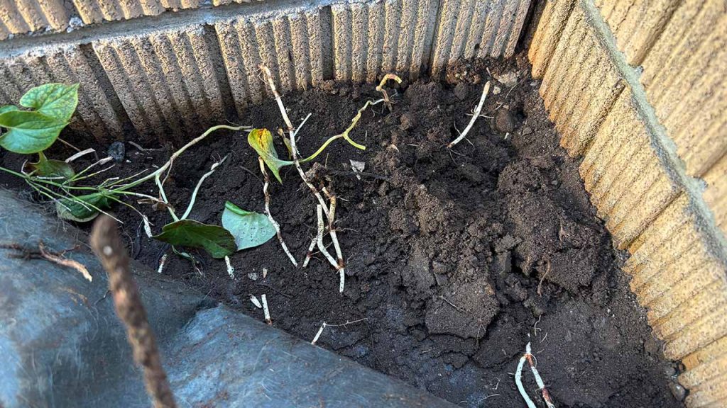 このくらいの深さから、ドクダミの茎は進行方向を垂直方向から水平方向へと変え、比較的柔らかい土を選び、まだまだどこまでも伸びています。