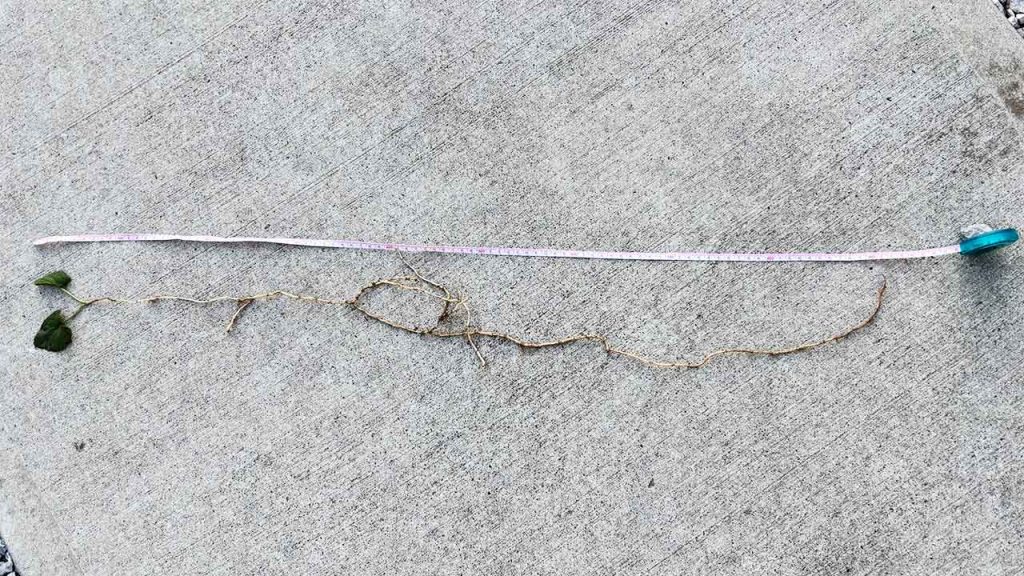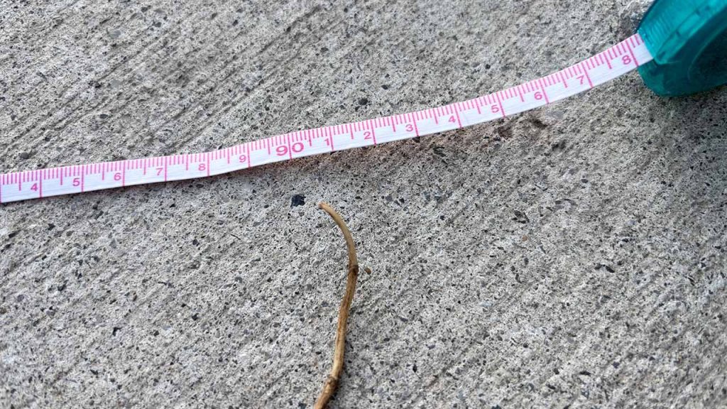 口惜しいですが、これ以上の掘削をあきらめ、今回掘り出したドクダミの長さを計測しました。