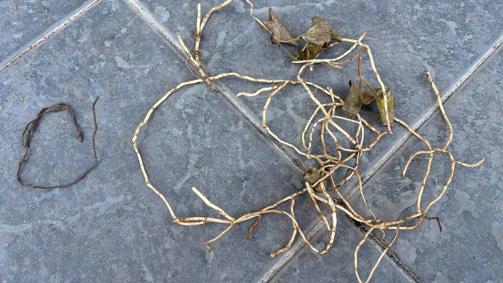 ドクダミの茎自体がもろく折れやすいというだけでなく、一本の地下茎が90cmも続いているのです。