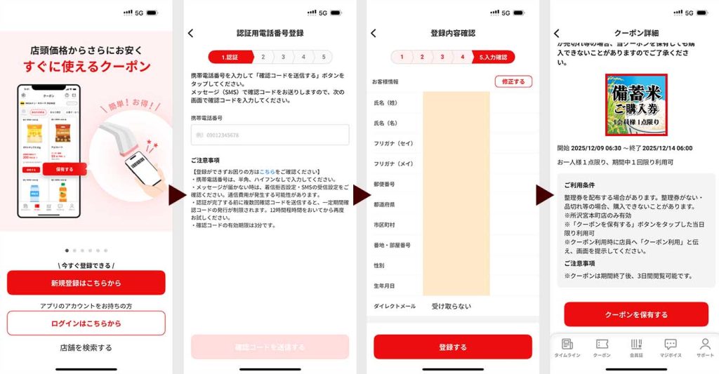 会員登録後、アプリ内の「見せるクーポン」に表示される「備蓄米ご購入権」を、購入時にスタッフに見せることで購入が可能となります。