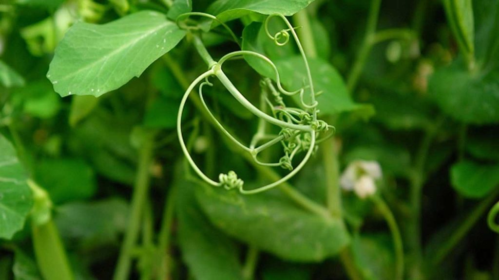 えんどう豆だけでなく、きゅうり等も同じく、巻きひげにより絡みつきながら成長する野菜です。果物でいえば、ブドウも巻きひげを使い成長する果物です。